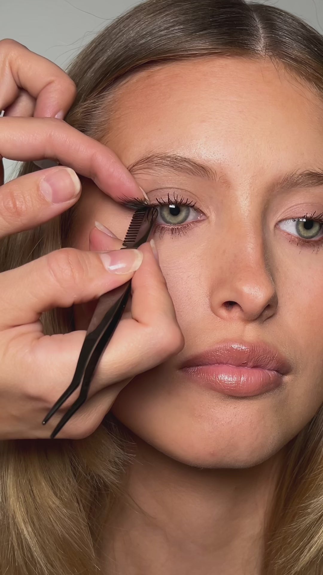 5. Placera fransarna ovanpå din naturliga franslinje och tryck försiktigt uppåt mot ögonlocket.